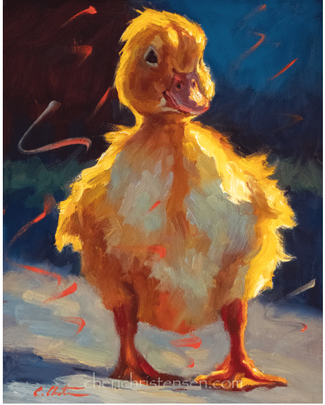 When an imaginative artist paints a duckling, she isn’t just accurately depicting a wild animal. Rather, she’s making visible a whole world of the mind and heart. Take two of Cheri Christensen’s oil paintings of ducklings, “Feathered Whimsy” and “Beyond the Water’s Edge.”