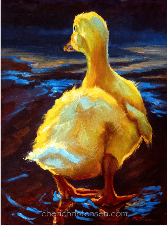 Changing gears a little, we find a similar inventiveness in Christensen’s painting, “Beyond the Water’s Edge,” (above) though the feeling in this one is different. Here, our protagonist, the backlit yellow duckling, wades into dark water beneath an even darker sky. Presumably it’s night, and our little guy is facing the shadowy unknown, alone, as every young life must someday do.