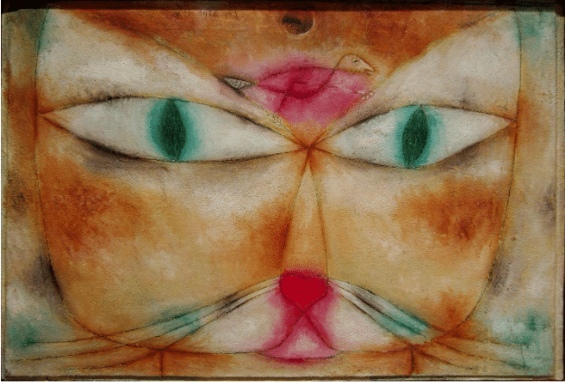 Paul Klee, Cat and Bird, oil and ink on wood, 38.1 cm × 53.2 cm (15.0 in × 20.9 in), MoMA. Klee wanted to let simple lines, shapes, and colors work for themselves.