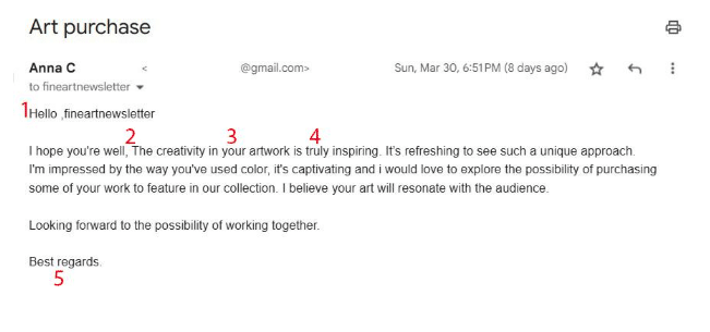 - The punctuation is wrong in the greeting, and they used “fineartnewsletter” as my name.