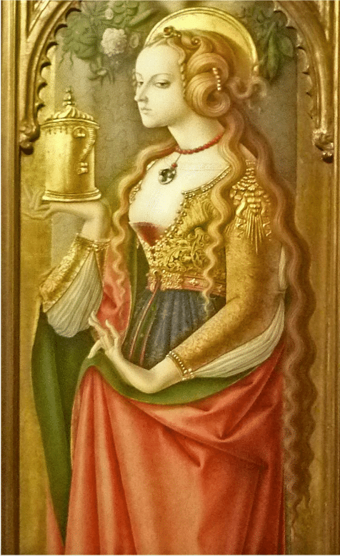 The Medieval look: This is a cropped image of an altarpiece of Mary Magdalene by Carl Crivelli, dated to circa 1480-1487. altarpiece in International Gothic style by Carlo Crivelli showing her with her characteristic long hair (in one Biblical story, she washes Jesus’ feet with her hair).