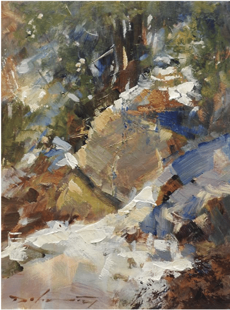 “Acrylic works well in hotter and colder temperatures,” he says, “but it performs best in higher humidity, such as next to waterfalls or at the coast.” Rick makes the most of that ideal environment with an array of unconventional tools to “sculpt” the paint surface. In the case of “Yosemite Snowfield” (top of page), he used a palette knife, a razor blade, and a credit card represent the rock textures. “Some of the pigment is quite thick, just by applying a lot of paint and using a stiff instrument to apply, rather than a brush,” he says.