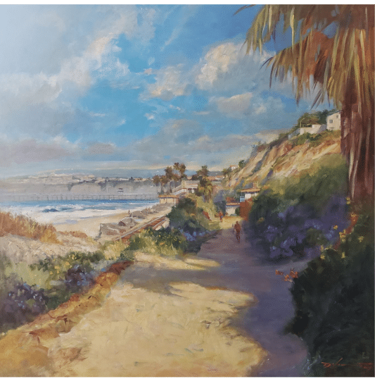 Delanty’s “Beach Trail, San Clemente” won “Best Acrylic” for the year 2022-23 in the Plein Air Salon competition. Despite the name and PleinAir™ Magazine’s sponsorship, the PleinAir Salon accepts studio paintings as well as work painted outside. But Rick did indeed create this painting (above) en plein air, despite the canvas’s colossal 16 square-foot bulk and the acrylic medium’s natural tendency to dry too quickly for extensive adjustment.