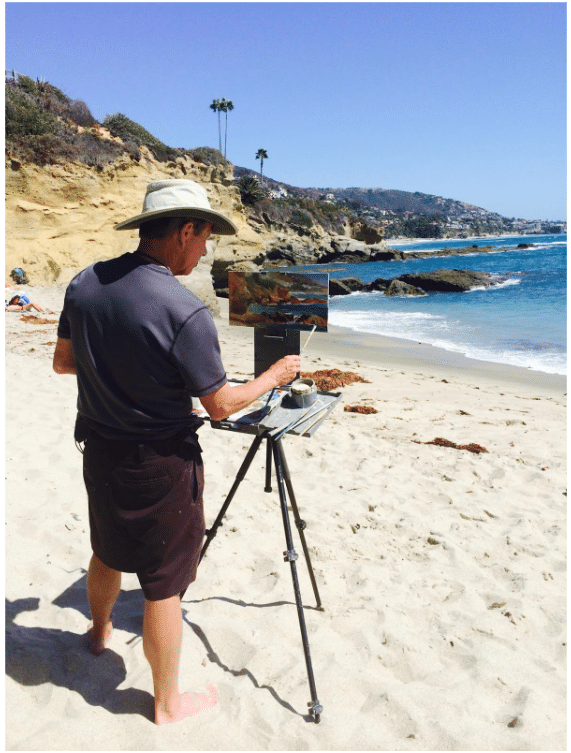 “It is possible to do large paintings outdoors in acrylic,” he affirms. “Drying of the paints usually occurs on the palette, when wind or breeze dry the pigments more rapidly. I use Golden Open paints, which stay wet on the palette longer, a wet paper towel under my colors as I mix, and paint from back to front. I try not to re-do any areas, as time is of the essence in plein air painting with acrylics. (and I have gotten faster over time!).”