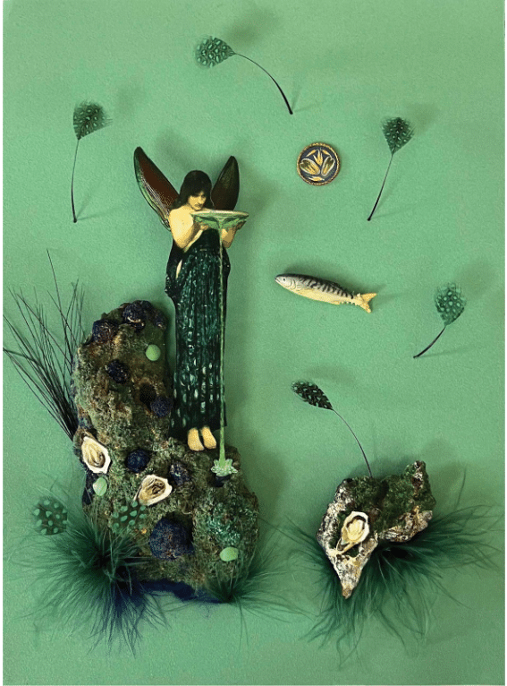 Maureen McCabe (b. 1947), “Circe (with Oysters and a Mackerel),” 2024, mixed media on velour paper, 13 x 10 x 3 in., collection of the artist; photo: Paul Mutino