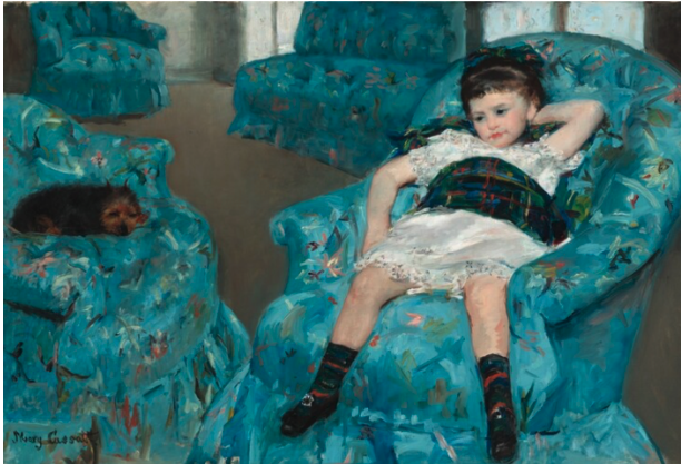 Evidently, Mary Cassatt, whose painting of the girl on the blue couch crowns this page, loved animals almost as much as children and mothers. In “Woman on a Striped Sofa with a Dog” (below) there’s more connection between the dog and the woman pausing at her sewing (below) than there is between the sleepy pooch and the bored little girl in on the bright blue furniture above.