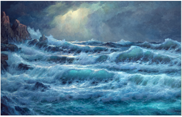 Alex Dzigurski, “Silver Sea,” oil on canvas, approx. 36” x 48.” Dzigurski I (1911-1995), was a Serbian-American master known as “The Poet of the Sea” for his ability to capture nature’s essence through sublime color combinations. His son, Alex II inherited his father’s exceptional skills and created his own unique style. He demonstrates the family legacy of dazzling moonlit seascapes steeped in multiple shades of blue in his teaching video, How to Paint Crashing Waves.