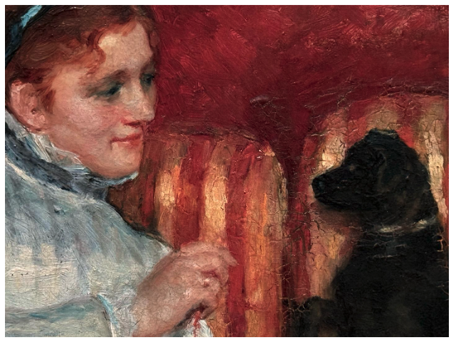 This painting, from 1876, and the one at the top of the page from 1878 both date to a transitional period in her career, when she was still seeking official recognition from the French Academy. Here, the deep-red wall behind the sitter can be considered part of that effort, as this work was painted in the same year that another of Cassatt’s works was finally accepted to the Salon – albeit after she darkened its background. Three years later, at the invitation of Degas, Cassatt began exhibiting with the Impressionists.