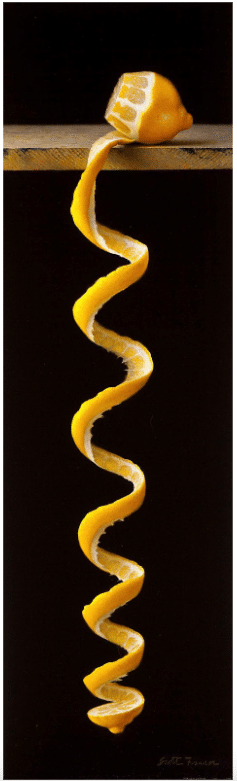 Contemporary realist Fraser takes the motif, sheers away the symbolism, and runs with it. “Contemporary painters still use this luscious visual conceit,” Fraser says of the peeled lemon in painting. “I decided to exaggerate the effect by extending the lemon peel to extreme lengths, keeping the eye moving and creating a kind of surreal tension.”