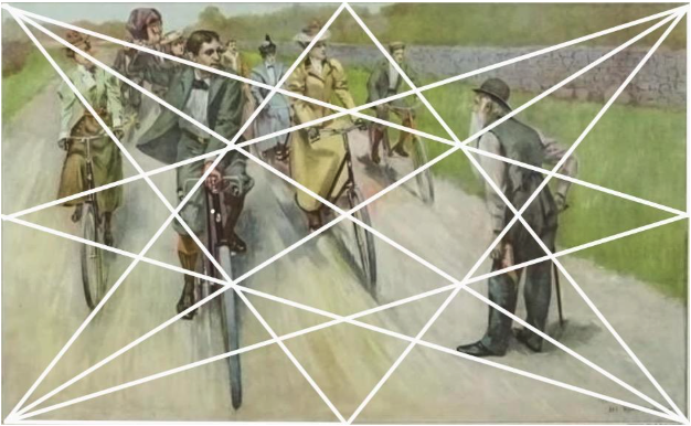 Compare the two images above. Note how the bicycle wheels arrange themselves precisely at and around axis points and intersections of the overlaid white grid lines. Or look at the heads of the figures clustered to the left of the center – check the grid to see how each rider’s head rests on or above the guiding diagonals. In contrast, notice how the grid reveals that the onlooker to the right of the group is distinctly separate; he’s neatly enmeshed in a vertical enclosure that opposes the horizontal arrangement of the riders. The result is a balanced and harmonious composition that’s lively with tension and syncopated rhythm.