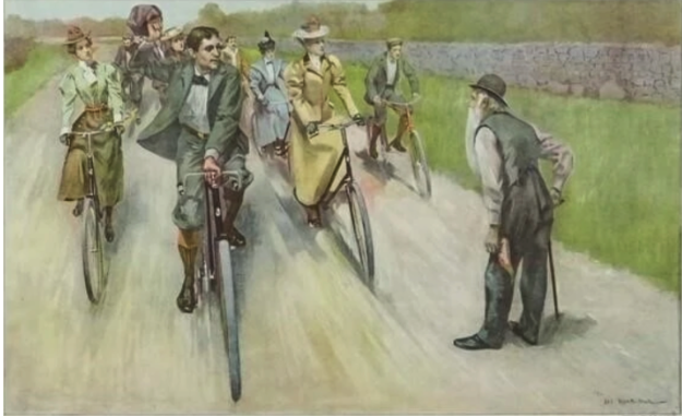 Here the structure does more than arrange things pleasingly; it also supports the content: the “century run” of the title confirms that this painting is a wink at the perennial standoff between youth and age. One side (the left) is all motion and speed, while the other is solidity and immobility. There’s even a sly visual rhyme that reinforces this reading “hidden” in the symmetrical arrangement of the parallel vertical lines of the bicycle wheels and the old man’s walking stick (or cane), all about the same size, neatly arranged in a sequence, and all tilted at the same angle.