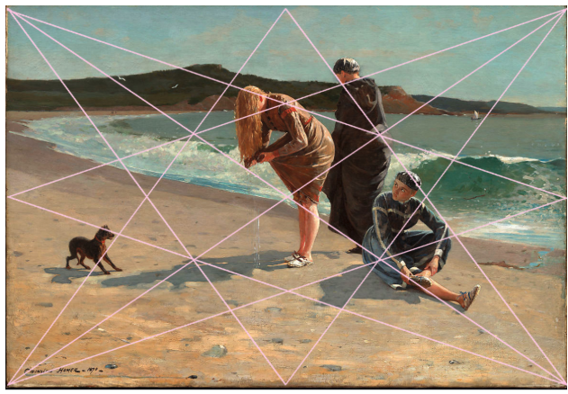 Like many artists trained in ateliers or academies, “Homer believed that art was a craft to be studied,” Silverman says. The structural overlay in the beach scene by Homer above is created by drawing an “X” from corner to corner and then drawing a large four large triangles with their points lined up with the central intersection of the two diagonals of said “X.”