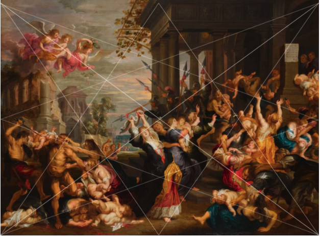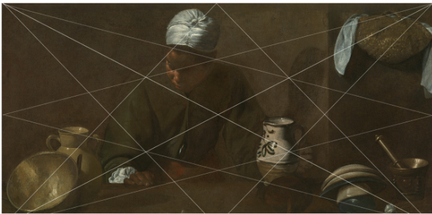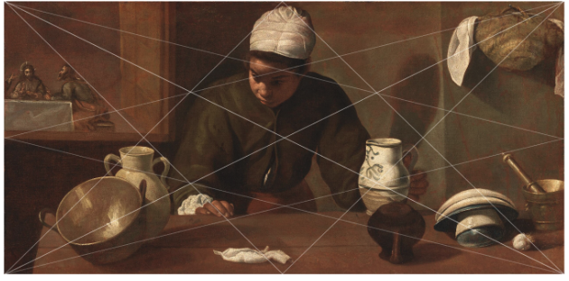 “There are two paintings attributed to Velazquez that I use in my classes as examples of where the grid is kind of a check of quality,” Silverman says. “The version with the Last Supper (top) seems alive. With the cook listening to the supper conversation, it’s a striking scene. The other version (without the Last Supper scene, bottom of the two) seems randomly composed and chaotic. I assume this (bottom) one was done first and corrected in the final version (above).”