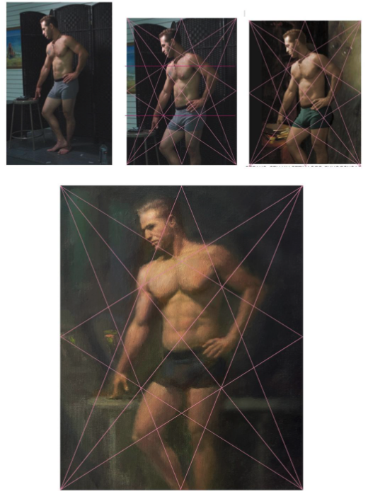 From the top left to right, the first image is the painting before applying dynamic symmetry. The next is cropped for dynamic angles, and the third shows the background simplified by a reorganization of values and shapes. Below the first three, the final version reorients the figure fully in conformity with the grid.