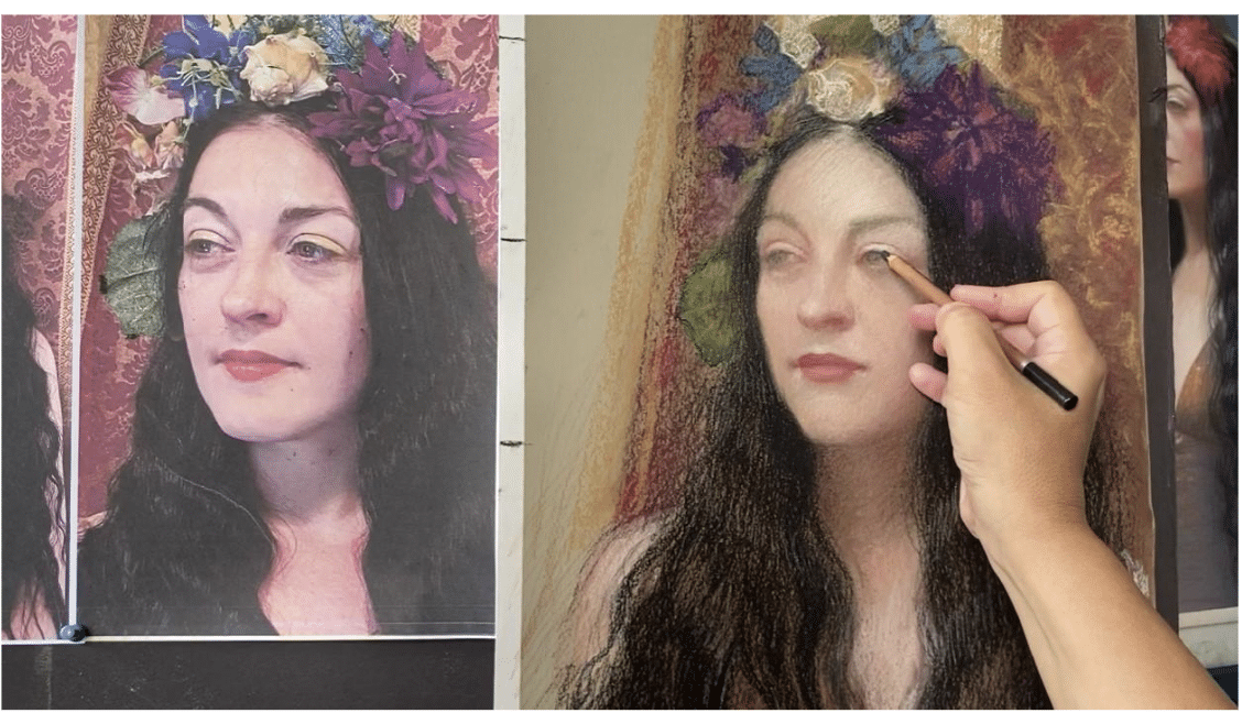 On the left, you can see Carol’s photo reference for her pastel portrait on the right.