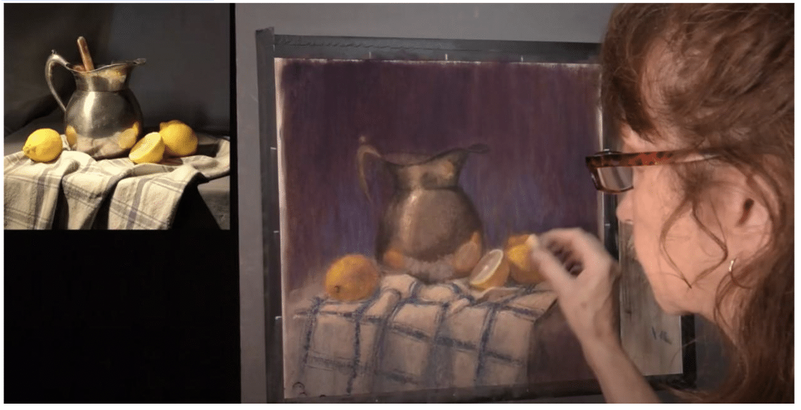 French-Canadian pastelist Suzanne Godbout explained how she uses the golden ratio for her still life composition, featuring a silver pot with intensely yellow lemons, which she balanced with touches of red and blue in the rest of the painting. She says, “Feelings and artistic choices are what guide me to decide when to stop refining, just enough to express my vision.”