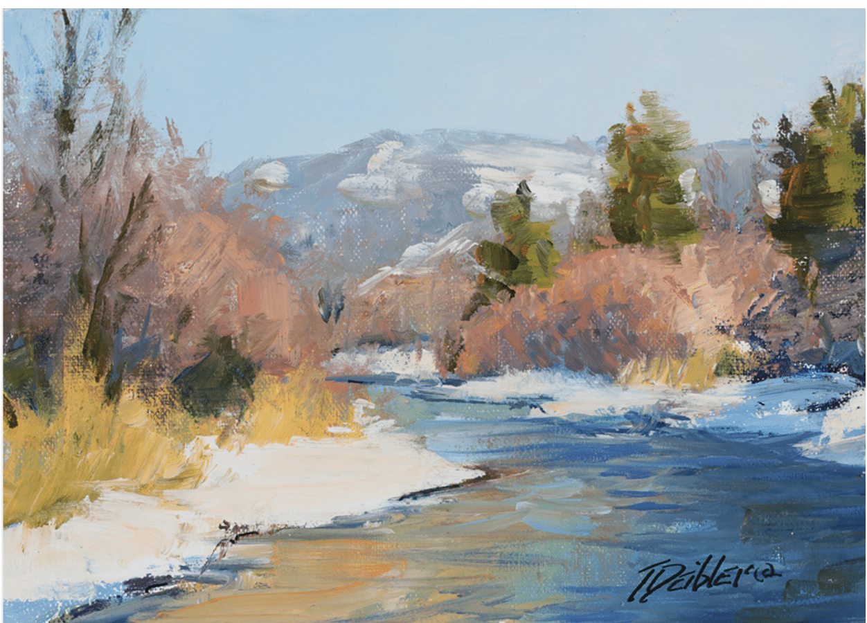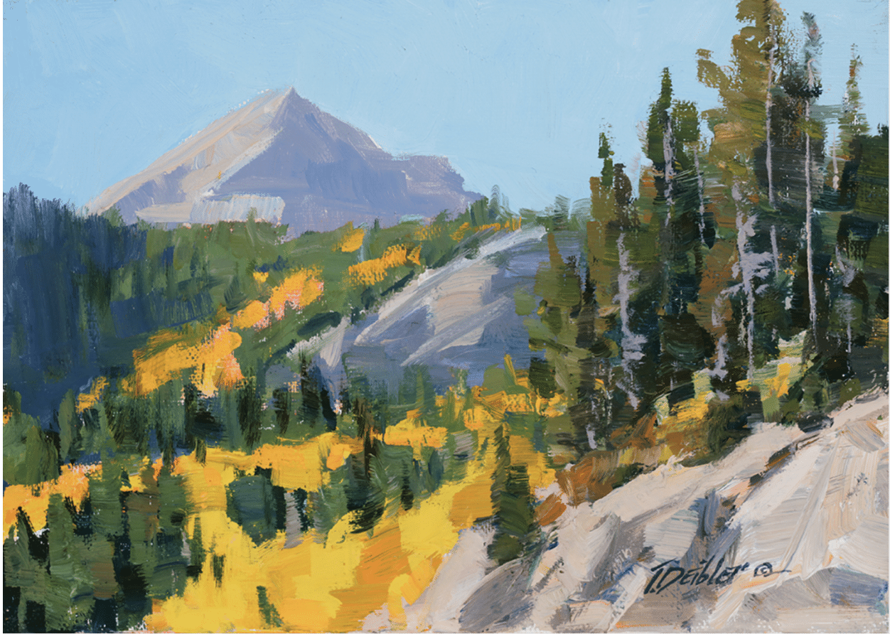 Born and raised in Oklahoma, Deibler’s passion for landscapes, mountains in particular began after seeing the 1956 movie The Mountain as a young boy. His aspiration to be a landscape painter started at age 13 after receiving a copy of the 19th-century mountain climber Edward Whympers’ book Scrambles Amongst the Alps. When opportunity allowed, Deibler moved his family to southern Colorado in 1999 where the mountains became his constant inspiration.