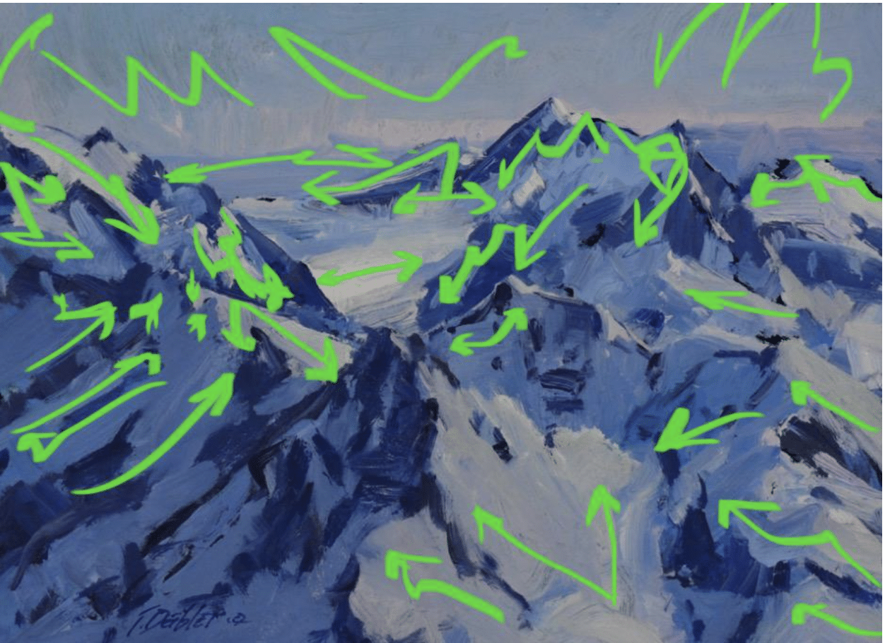 Directional Brushstrokes: This diagram shows just the paint handling as an independent overlay placed on top of what it’s a painting of (the mountains). Tim Deibler’s brushstrokes (green highlights) direct the eye in multiple directions, forming an intricate counterpoint with the directional lines of the mountains themselves.