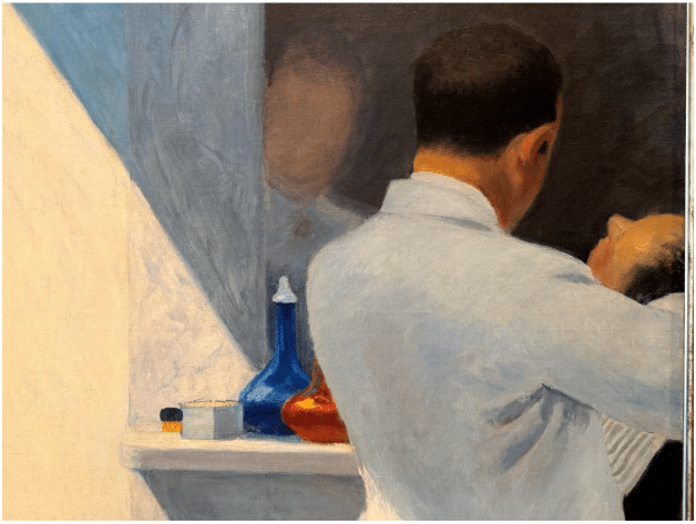 Hopper deliberately suggests and withholds information about his characters. Is the woman reading with the absent expression the wife (or the daughter) of the man in the barber’s chair? If so, then her boredom and lack of interest in the proceedings says plenty about how empty and uninteresting she finds their life together. Whatever her relationship to the others, for her this is just another boring moment in a tedious life filled with boring moments.