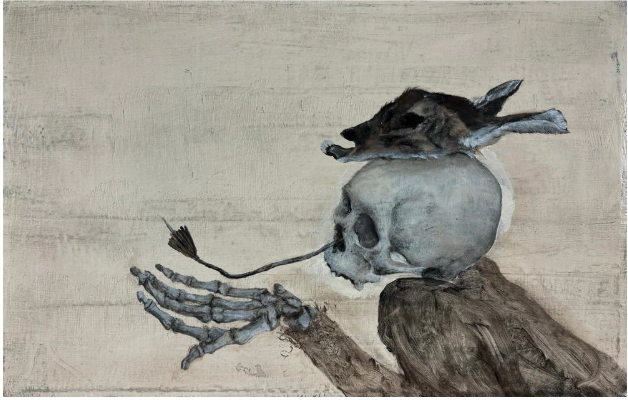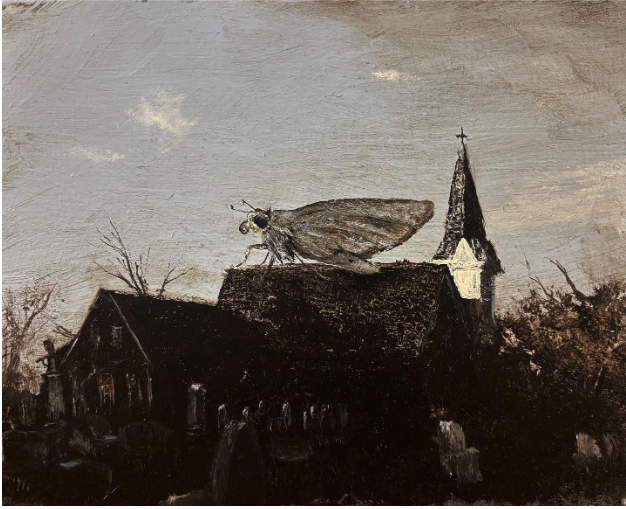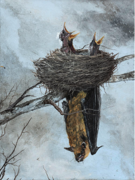 Miles Cleveland Goodwin, Bat hanging from bird nest, 2024, oil on linen, 16 x 12 inches