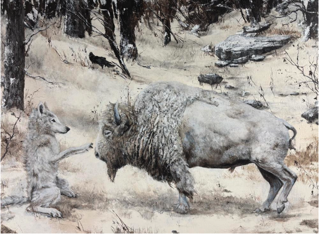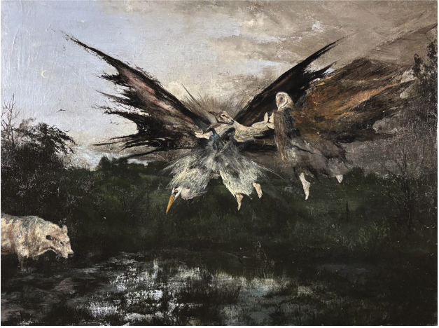 While “Strange Angels” (above), may allude to “Biblically accurate” descriptions of angels in the Books of the Prophets and Revelations, Cleveland’s otherworldly beings manifest in a realm between the natural and the supernatural. It is dusk, with a pale crescent moon. Two hovering “angels,” one with an owl’s head, and the other part bat part crane with the head of a sheep, carry between them a pale robed figure, hands folded in deep prayer. A strange composite animal (part cow and part bear or dog?) gazes into a swampy pool of water and reeds. The composition recalls Renaissance depictions of the Annunciation or Judgment Day.