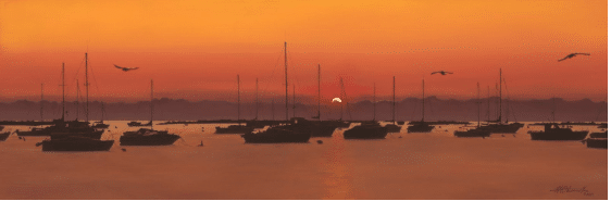 “The heavy-weighted dark pattern of boats with their masses extended into the air provides the perfect weight to the lower half of the painting, indicating that the horizon is actually higher than it is, and giving us a sense of calm, peacefulness, and safety. That perceived peacefulness is echoed in the simplicity of the sky and setting sun.