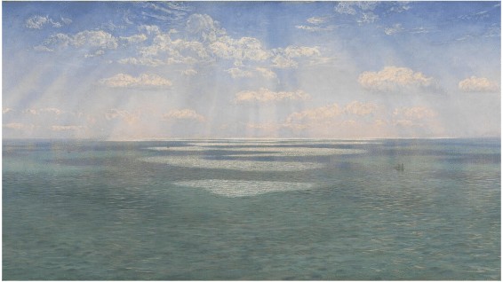 Instead, he renders one tiny ship in the middle ground, offering us the opposite: a dizzying sense of immense scale, seen as from a God-like perspective, but not at all kitschy or cliched. This artist didn’t just paint a pretty view; this is an invitation to a vision of life illuminated – a grand immersion in the realm of the immaterial: nothing but water, streaming light, and wind (implied in the patterns on the water’s surface).