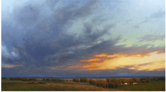 Kim Casebeer is a contemporary artist carrying forward the notion of expressive, if not spiritual, light in 21st century landscape painting. In titling her large (40 x 72 inches) oil painting Reverence, (above), Casebeer connects a “big sky” view of North American topography with the sense of the sacred we feel when struck with awe by a beautiful sunset.