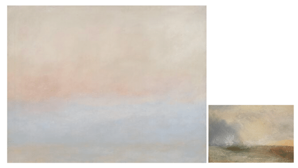 Jon Schueler, “Blue Sky and the Sea.” Nov. 1973. Oil on canvas. (left) Image and data from the Jon Schueler Estate. Late Turner (c. 1845) for comparison (right).