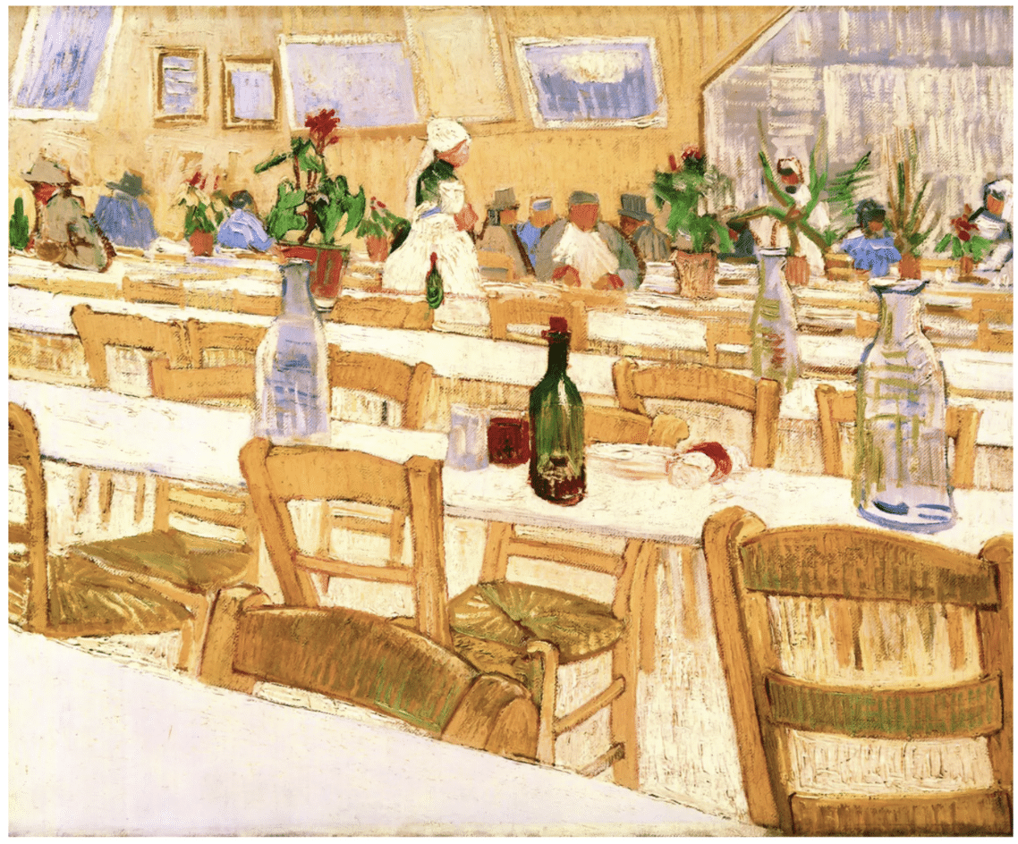 The image above, and not the one at the top of the page, is the authentic Van Gogh. Incredibly, the forger of the supposed “second version” of the restaurant interior painting was working from a black and white photo. That meant the counterfeiter had to guess the colors of the flowers and incorrectly decided to make them sunflowers, which would not have been in season then (late fall), instead of autumn begonias, the proper flowers blooming at the time Van Gogh painted the original “version.”