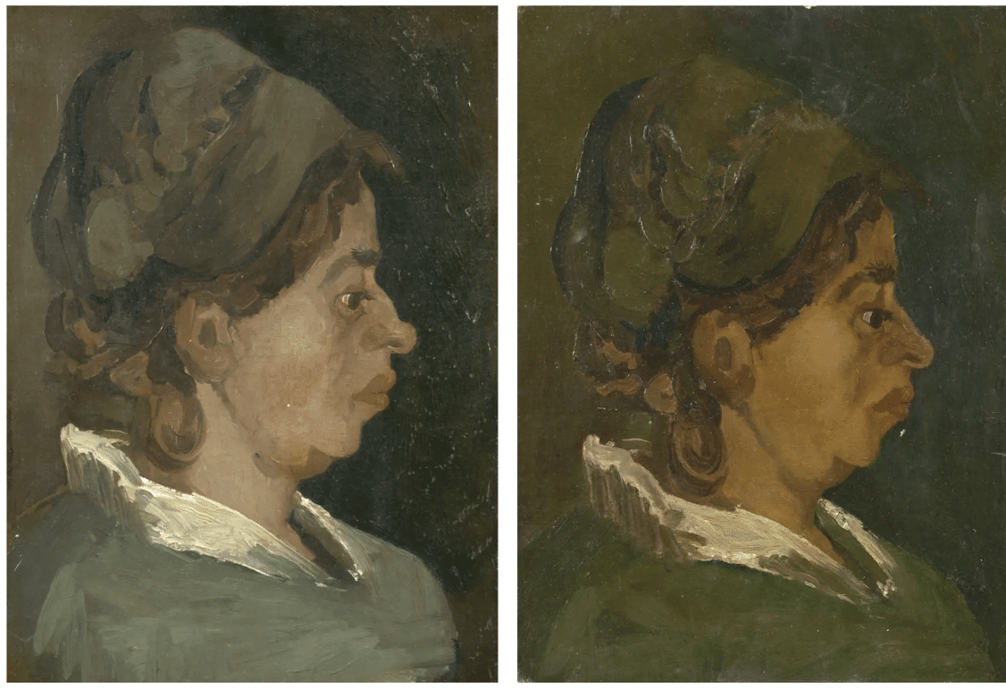 The real “Head of a Woman with a green Bonnet” (c. 1884) is on the left. “Head of a Woman” (c. 1905), on the right, is a forgery.