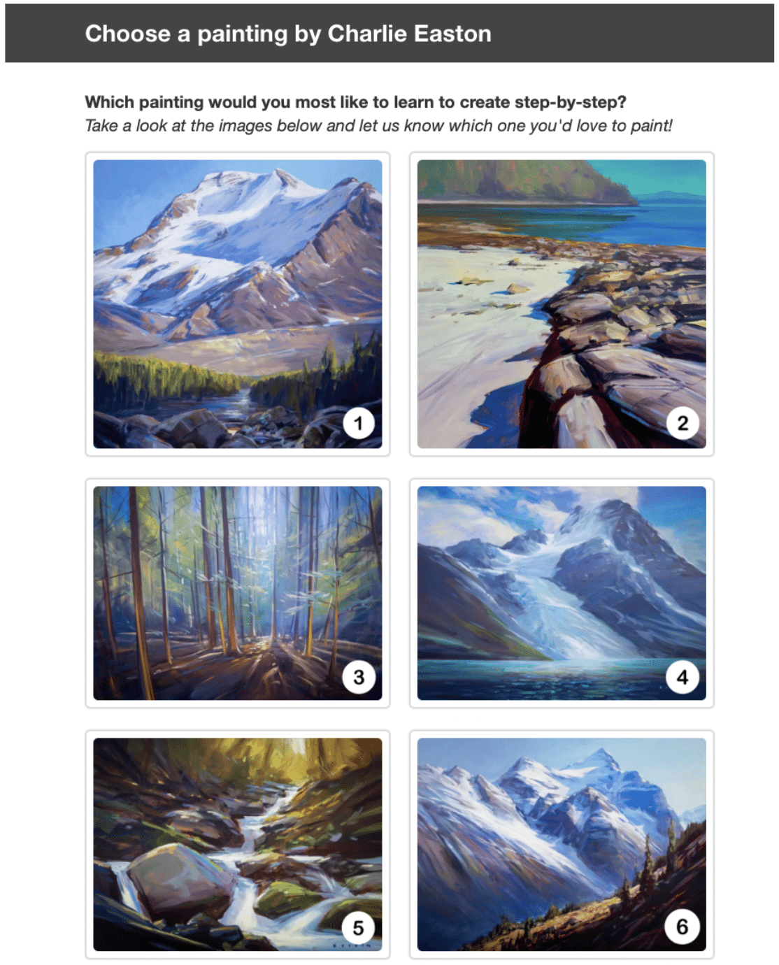 Choose a painting and let us know what you want to learn how to do! Streamline’s video folks will pool the answers and use them to help guide Charlie’s lesson plans.