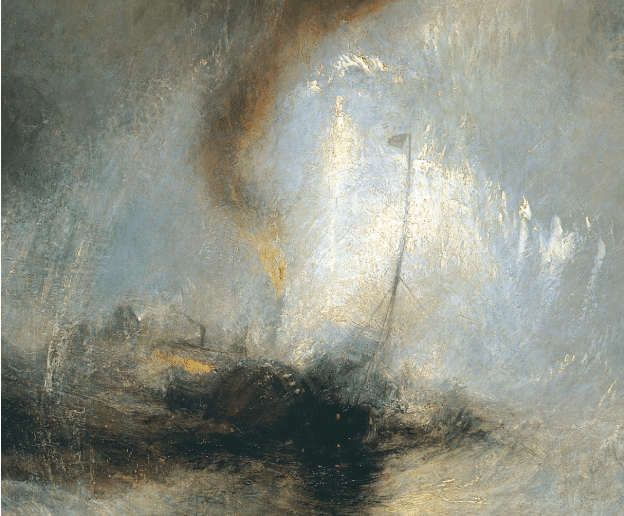 JMW Turner, “Snow Storm – Steam-Boat off a Harbour’s Mouth Making Signals in Shallow Water, and going by the Lead. The Author was in this Storm on the Night the “Ariel” left Harwich,” 1842, oil on canvas, 91 cm × 122 cm