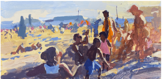 “This little 6×12-inch jewel is action-packed. How the foreground goes from a really warm/dark value and transitions into a cool/soft-edged distance, well, it’s breathtaking. I especially love the true rendering of the figures… there’s a party going on!”
