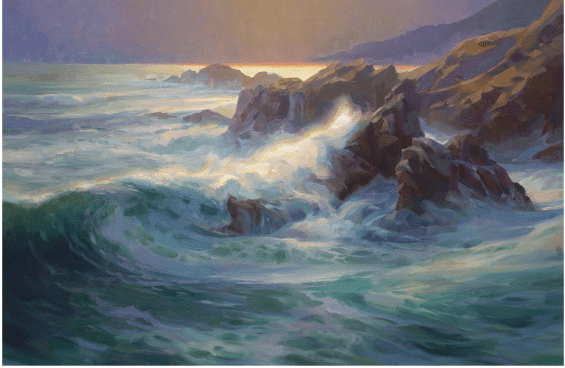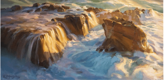 Robin Caspari’s painting, “The Edge,” (above) celebrates the raw power of surging ocean waves and jagged rock with expression and skill, qualities that won it first place in the May 2022 PleinAir Salon.