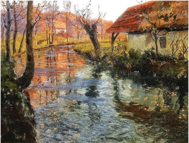 Thaulow painted his inspiring painting, “The Mill Stream” (above) in Oslo. His palette is joyous, almost flamboyant, and the painting is saturated, speckled, and sprayed with prismatic colors. Note that the title calls attention to the stream itself, not the picturesque old mill, which nine out of ten other painters would have focused on (all he gives us of the mill is one cropped, anonymous wall with a waning roof).