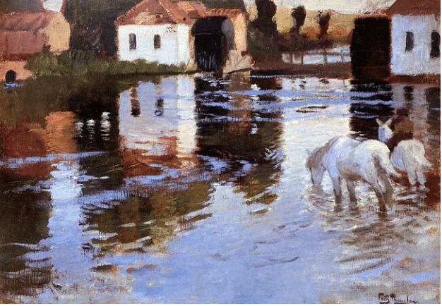 Again, Thaulow gives us, in Horses Watering at the Bridge at Montreuil-sur-Mer, sparkling pastoralism and serenity, with lively color and white horses wading and drinking. But let’s contrast those two with the painting below.