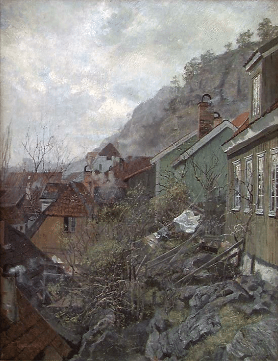 All of these works represent beyond masterful renderings of water, but how different, how distinct one from the other! Each conveys a distinct feeling and expresses a different truth! He could lean into a grittier realism too, as for example, in the painting below. He painted this crowded section of houses in Kragerø, the country’s largest urban shipping town, at a time when Norway was in a depression and many were leaving for eastern Europe and America.