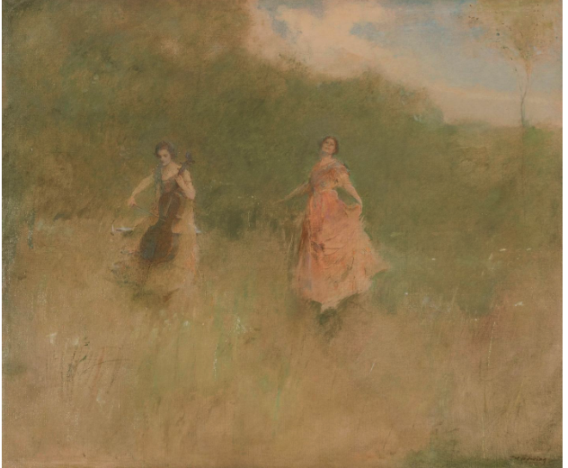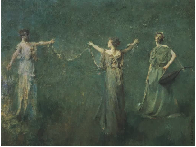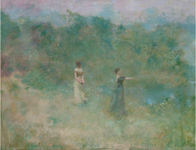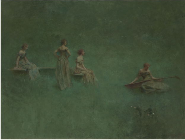 Where Dewing departed from this precedent, he clothed his figures in elegant modern dresses, freed them from their strictly allegorical significance, and placed them in nebulous, atmospheric yet recognizably natural. The effect is to render an idyllic moment of waking life with the magic of memory and dreams.