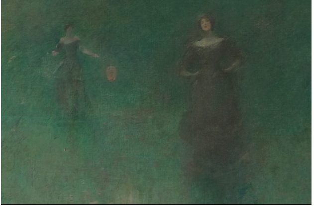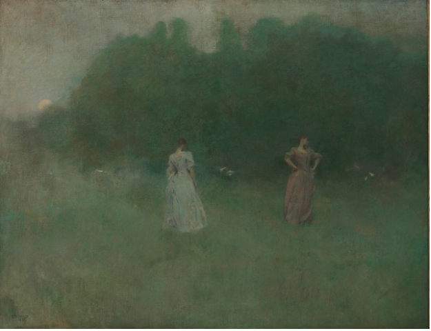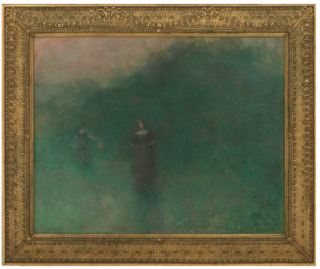 Dewing created Before Sunrise of 1894-95 (above), and its companion piece, After Sunset of 1893 (end of article), In Before Sunrise, two women emerge from a soft field at dawn, enveloped in mist glowing with the first rays of the sun. As most of the women in this series, they don’t relate to each other, each enclosed in her own psychological world. Are they together or part of a group outside the frame? The woman in the background carries a Japanese paper lantern; a poetic allusion, perhaps, to the soon-rising sun?
