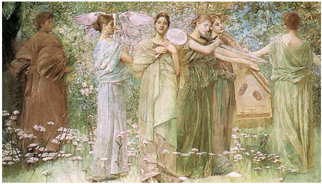 It wasn’t unusual for the time to find symbolic, classical-looking women standing in for things like “Spring,” “Prudence,” or “The Spirit of Music” in book illustrations, advertisements, murals and paintings. Dewing’s “The Days” 1886/87 is typical: