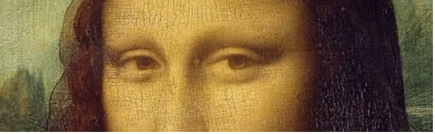 Then again (is there a conspiracy theory to be developed here?), it kind of looks, if you cover the eye on the right with your hand, like the eye on the left is looking toward us, but if you cover that eye and look at just the one on the right, that eye seems to be looking off to the side. Could that mismatch, that subtle twist, be partly why the Mona Lisa seems so sphinxlike and endlessly intriguing? Something in her “look” inspired the famous line about her “smiling at things beyond our ken (i.e., knowledge),” as though she knows a secret. And it isn’t just the smile. It’s the eyes as well that suggest the sitter is “full of strange thoughts and fantastic reveries and exquisite passions” the truth and meaning of which we, her viewers, will never know.