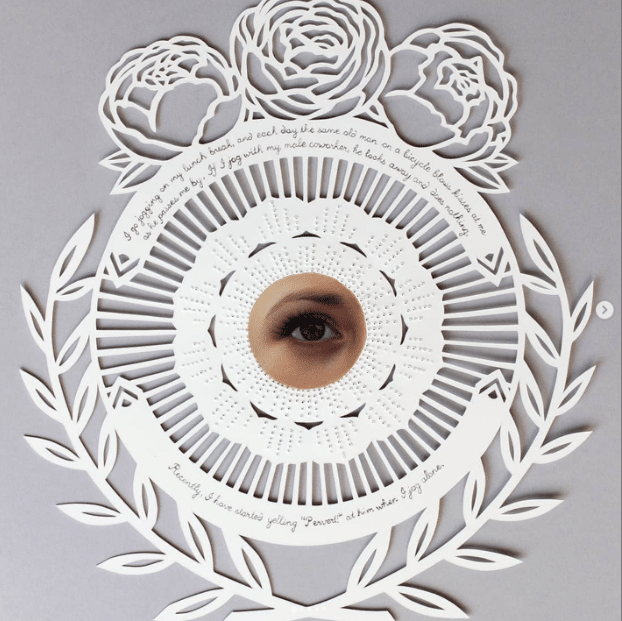 On the contemporary side, while much has been made of “the male gaze” in art history, at least one artist, Diana Corvelle, is taking that concept forward creatively while turning it on its head. Corvell’s intriguing “Lover’s Eyes” series of seemingly decorative works encircles exquisitely painted eyes within intricate paper cuts inscribed with statements by women — the eyes’ owners — relating personal experiences to do with patriarchy and outright misogyny.