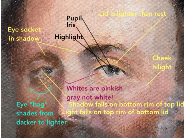 That aside, careful study of relatively simple painted eyes will show the essential moves you need to make to paint believable eyes.