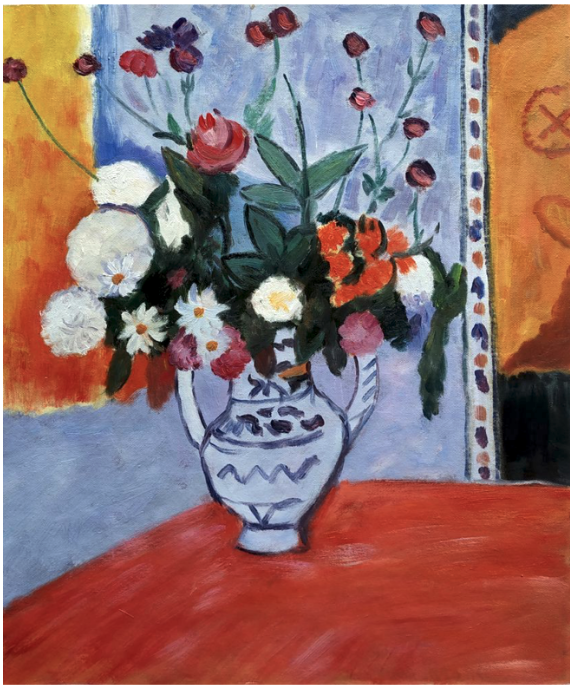 Everything about Matisse’s vase of flowers at the top of the page expresses a jolt of joy and delight at enjoying a vase brimming with colorful wildflowers. An unfussy, even childlike exuberance radiates from the simple brushwork, distinct primary colors, and clean bright edges laid out in flattened un-technical perspective. It was simply, for Matisse, a chance to share a moment of pure enjoyment, “light . . . expressed by a harmony of intensely colored surfaces.” This was something new in art.