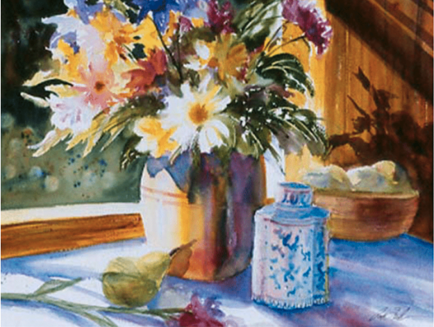 In Pat Fiorello’s watercolor “In the Window” (above) the subject is again vase of flowers beside a sunny window. But because of her expressive approach, it’s less a copy of what was there than a “vision” of a vase of a bouquet drenched with morning light. To do so, she made a multitude of in-the-moment “editorial decisions.” To immediately see this, consider how much more her vase of flowers acts like a fountain of colored light than a gathering of botanical specimens, even though we’re able to identify several specific species.