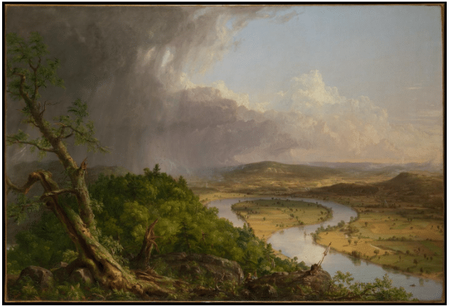 When Cole painted “The Oxbow,” the nation’s president was Andrew Jackson, known for his imperial style of governing, his support for slavery, and for the forced removal of Native Americans from their traditional lands. Cole hated Jackson and mocked him in another of his famous paintings, “The Consummation of Empire,” the third in his five-painting series “The Course of Empire.” That allegorical series (see link above) illustrates the rise and fall of Empires; it begins with an Edenic paradise and ends in downfall, with civilization in ruins, defeated by time and eternity, being reclaimed by nature. Cole completed it the same year he did “The Oxbow.”