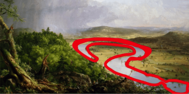 Zooming out to the whole painting, we can see that Cole deliberately divides the landscape diagonally in half. There’s God’s sublime creation on the left, storm-clouds, blasted trees and all, and on the right, cultivated, completely altered land, pastoral yet dotted with plumes of smoke from farmhouses and mills. Between the two halves he places the river – (an “oxbow” is a meander, where a river seems to backtrack on itself) – in the form of a question mark.