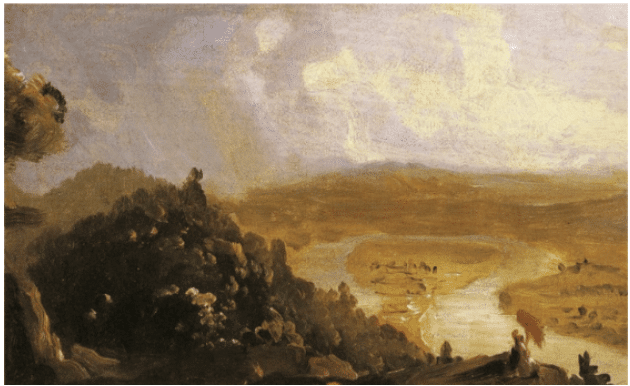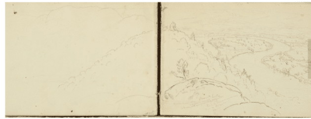 Cole’s oil sketch of “The Oxbow” (above) in which he created the question mark (not present in his pencil sketch below) by including a woman with a parasol.