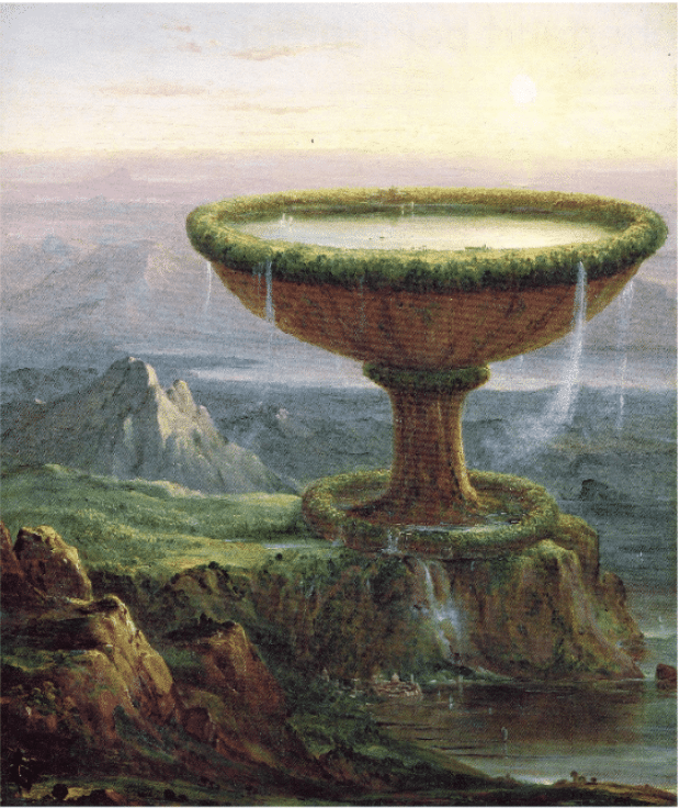 The Metropolitan Museum calls it Cole’s most mysterious, a work that “defies full explanation,” a landscape within a landscape: the fantastical goblet stands on conventional terrain, but its inhabitants live along its rim in an idyllic world all their own. Lush verdure covers the brim, broken only by two tiny buildings, a Greek temple, and an Italian palace. Where the water spills to the ground below, grass and a more rudimentary civilization springs up. Multiple interpretations abound.
